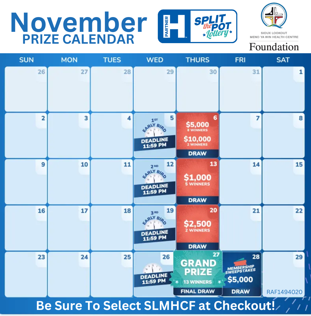 The Sioux Lookout Meno Ya Win Health Centre Foundation is one of 83 Ontario Hospital partners of Split the Pot Lottery for 2025!! You may already know that this lottery bringsĀ big win opportunities for multiple lucky supporters. Prizes include weekly early bird cash draws (approximately $70,000 total in November) and a guaranteed $500,000 jackpot which is split between 13 GRAND PRIZE WINNERS, each taking home a split of the pot after the November 26, 2025 deadline! This is different from a traditional 50/50 draw as the 13 grand prize winners “split the pot” as follows: