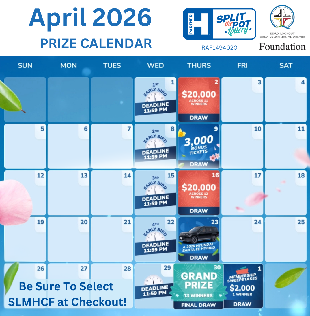 The Sioux Lookout Meno Ya Win Health Centre Foundation is one of 86 Ontario Hospital partners of Split the Pot Lottery for 2026!! You may already know that this lottery brings big win opportunities for multiple lucky supporters. Prizes include weekly early bird draws (approximately $105,000 total with over 3000 lucky Early Bird winners in April) including a chance for one lucky supporter to win a 2026 Syundai Santa Fe Hybrid SUV during week 4 of this draw!! April sees the highest jackpot of the year – a guaranteed $600,000 jackpot this month, which is split between 13 GRAND PRIZE WINNERS, each taking home a split of the pot after the April 29, 2026 deadline! This is different from a traditional 50/50 draw as the 13 grand prize winners “split the pot” as follows: